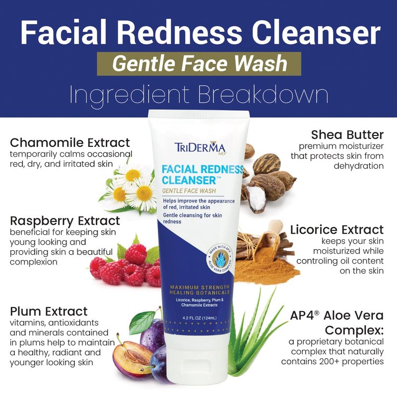 - Gently cleanse irritated skin, reduce the look of redness and help improve uneven skin tone with TriDerma's Facial Redness Cleanser! Specially formulated for the face and upper chest, this cleanser won't agitate your complexion and can be used on all skin types.