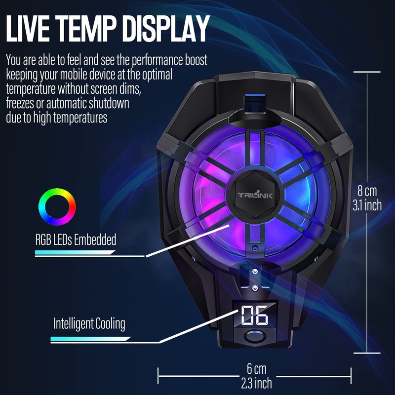 - ✅ Advanced Cooling Technology - TRILINK Cell Phone Cooler adopts the newest semiconductor refrigeration radiator technology that can cool your devices instantaneously, keeping your mobile device at the optimal temperature without screen dims, freezes or automatic shutdown due to high temperatures, and preventing its performance from being compromised. You are able to feel and see the performance boost with the featured live temperature display.