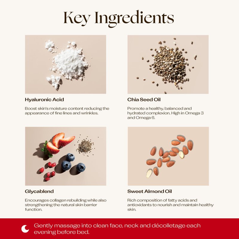 - Overnight Rejuvenation: Enhanced with Glycablend and co-enzyme Q10 to diminish fine lines and combat free radicals as you sleep