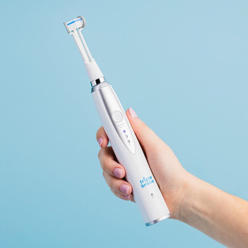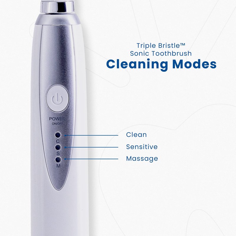 Triple Bristle Sonic Electric Toothbrush - CLEANER TEETH & BRIGHTER SMILE IN 1/3 THE TIME Our PATENTED 3 sided toothbrush means one third the time spent cleaning. Triple Bristle has been scientifically designed to clean your teeth better in 1/3 the time of an ordinary sonic toothbrush. REDUCES LEVELS OF PLAQUE, GUM SORENESS AND BLEEDING - Our DENTIST RECOMMENDED Soft Brush is safe for braces, implants and dentures. Easy to use 3 Bristle Head is perfectly angled to give THE BEST clean possible. ELECTRIC, RECHARGEABLE AND PORTABLE - We have combined the Triple Bristle Brush with a powerful Sonic Tooth Brush Handset. 31,000 Sonic Strokes PER MINUTE - Three modes: high/clean, soft/gentle, and massage. DENTIST CREATED & DENTIST APPROVED - Our cleaning design is recommended by dentists and hygienists. We have designed the best cleaning and best oral care treatment we possibly could. 4 years in the making - you will love it.