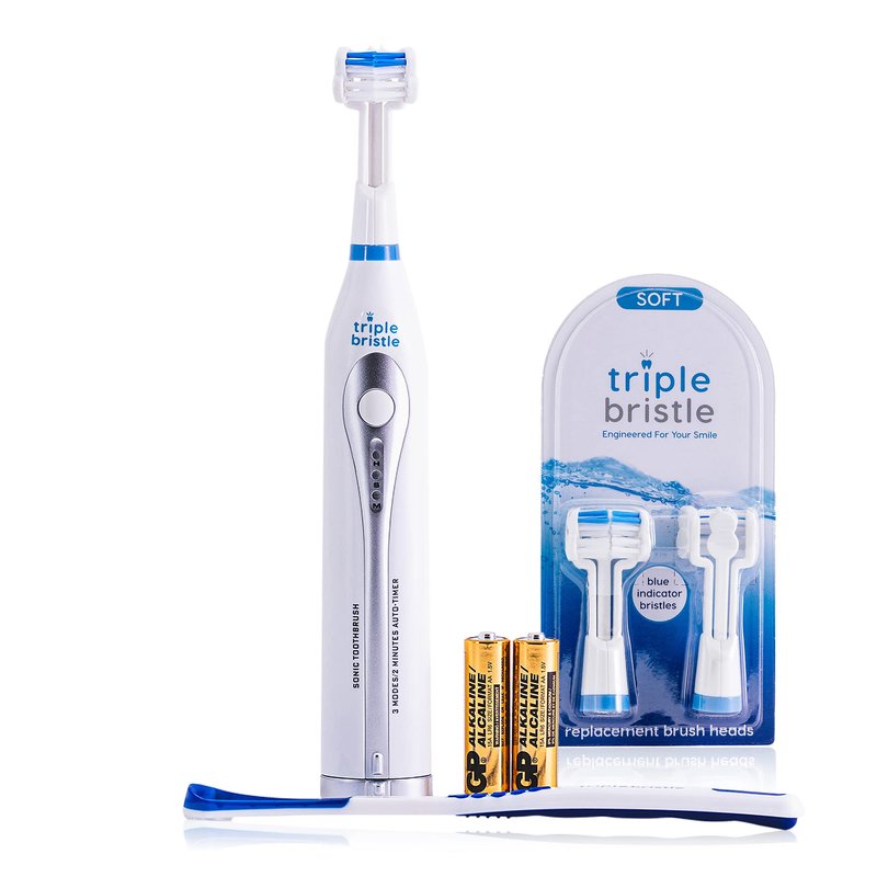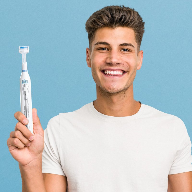 - ✅ TRIPLE BRISTLE GO - Our travel friendly battery charged sonic toothbrush has a patented 3-sided brush head that gets the job done in 1/3 the time. Triple Bristle has been scientifically designed with 31,000 sonic stroke vibrations per minute to give your teeth the best possible clean in 1/3 the time of an ordinary sonic toothbrush. The blue indicator bristles will slowly fade to white, reminding you it’s time to replace your brush head.