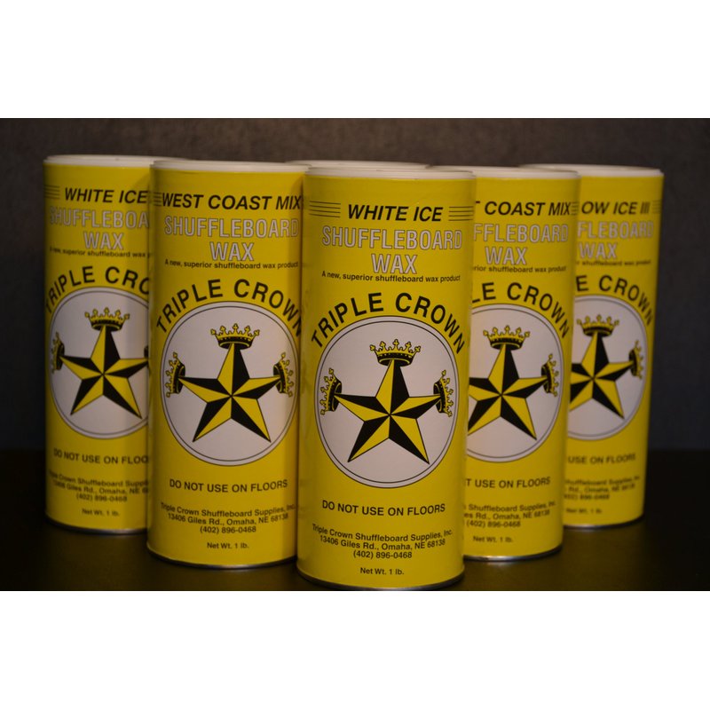 - Six Cans of Wax - You will get 6 one pound cans - 2 Cans of Triple Crown White Ice Shuffleboard Wax 2 Cans of Triple Crown West Coast Mix Shuffleboard Wax 2 Cans of Triple Crown Yellow Ice 3 PLUS