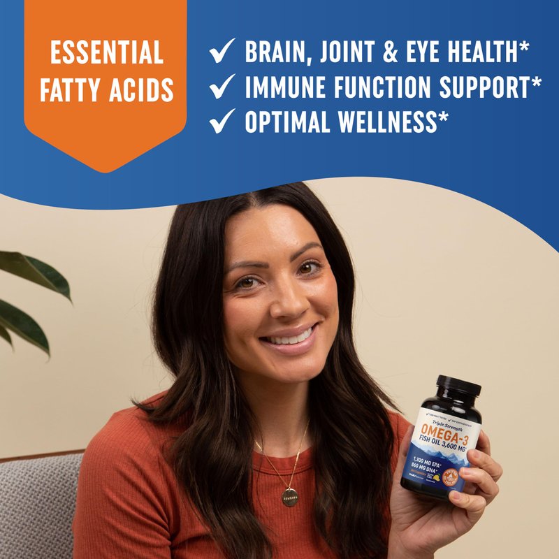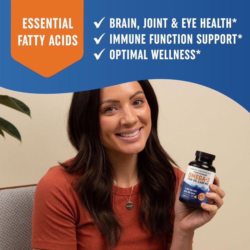 - TRIPLE STRENGTH FISH OIL: The fatty acids in fish oil support healthy joints, eyes, brain, immune system, and so much more.* This Omega-3 Fish Oil complex provides 3600mg of total fish oil per serving for ultimate support, and every bottle contains a 60-day supply!
