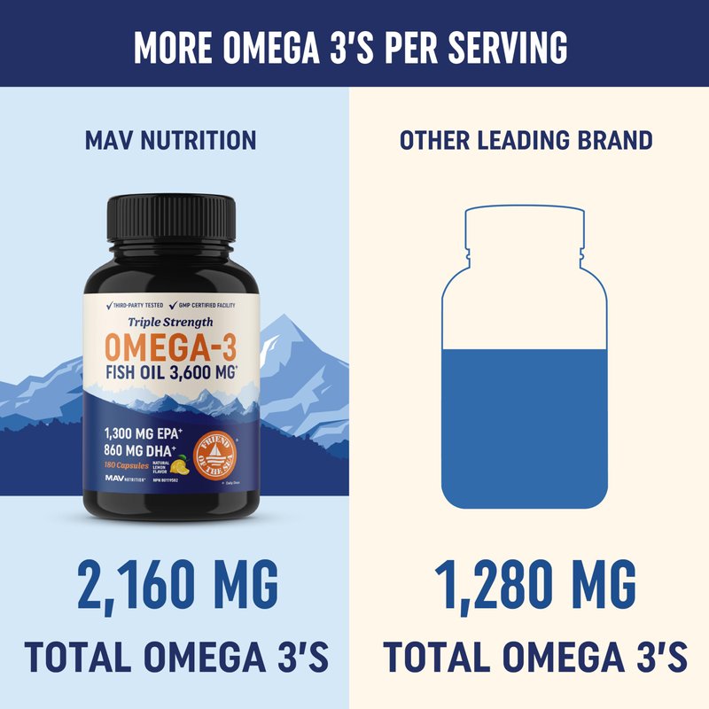 MAV Nutrition’s triple strength Omega-3 Fish Oil provides super concentrated amounts of essential fatty acids. Each serving contains 1296mg of EPA and 864mg of DHA.The fatty acids in our fish oil capsules support healthy joints, eyes, brain, immune system, and so much more. Omega3 Fish Oil by MAV nutritional supplements provides 3,600mg of total fish oil per serving for unmatched support. This fish oul is sourced purely from clean, wild caught fish from Friend of the Sea certified sustainable fisheries. Our non gmo fosh oil is highly refined using the best purification method: molecular distillation. This process increases potency and filters out mercury, heavy metals, PCB's, and other toxins to below now detectable limits for human consumption.* This fishoil Omega 3 supplement is refined and concentrated to give you clean, high quality oil with no fishy burps or aftertaste. And our premium fish iol burpless softgels are infused with a refreshing natural citrus flavor to make taking fish oit easier than ever. MAV Fish Oil is also available in bottles containing 180 soft gels. Fish oil supplements, like Omega XL, are packed with omega 3 fatty acid supplements providing a plethora of health benefits. They're nature made and suitable as supplements for men and supplements for women. Taking fish oil 1200 mg is an easy way to accept the excesses of natures bounty. For those who prefer a smaller dosage, fish oil 1000mg serves as an excellent alternative. Krill oil omega 3 is also a popular choice for those seeking a sustainable source of these beneficial fatty acids. Don't like swallowing pills? Try fish oil gummies, they offer the same benefits but with a tastier experience. Remember, when it comes to your health, always choose quality supplements.