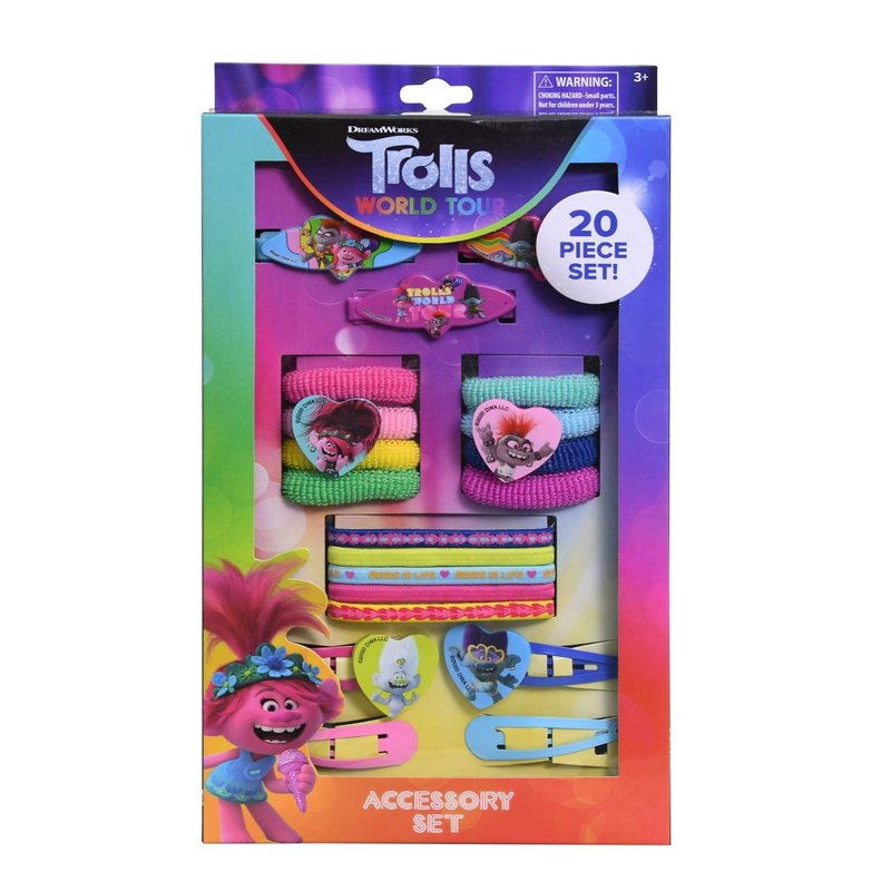 Trolls 2 Hair Accessory 20 Piece Set - Trolls World Tour Accessories Set Box for Kids with Snap Clips, Barrettes, Terries, and Elastics, 20 Cute Pretend Play Fashion Accessories