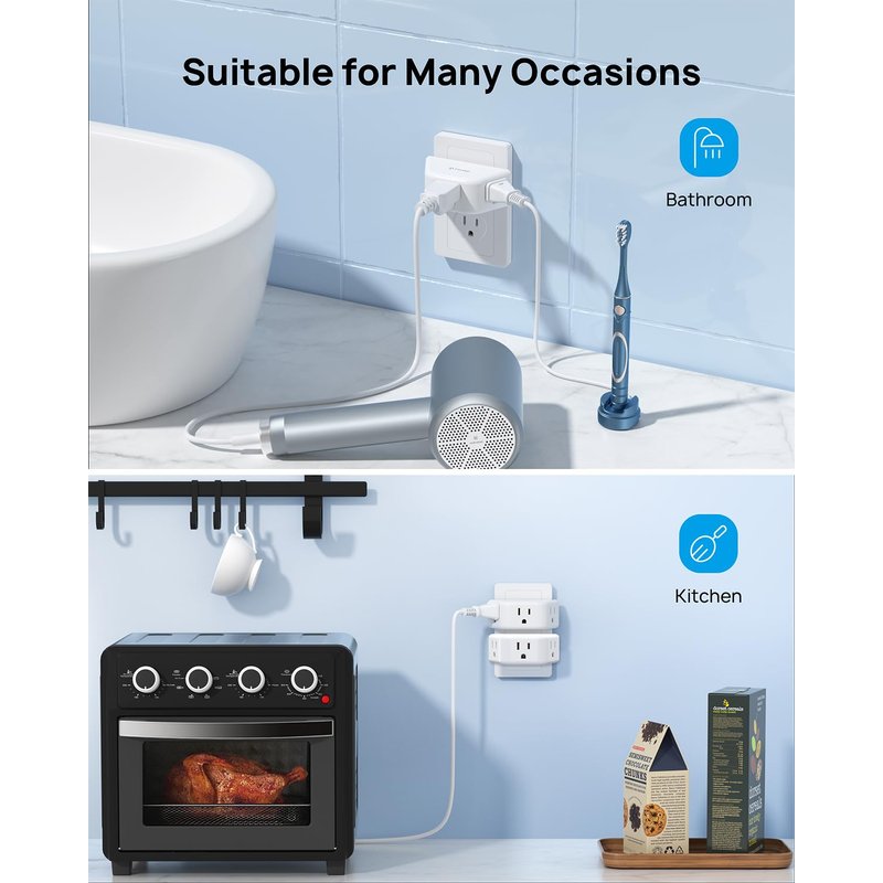 - 【Safe Assurance & Practical】The plug splitter is made of a Fire-resistant PC shell and certified by FCC & ROHS which can improve durability and safety. 2-pack is more practical, and you can plug in both plug extenders at the same time to charge up to six devices. This multiple plug outlet is suitable for any occasion, especially for the bathroom, kitchen, bedroom, hotel, college dorm room, etc.