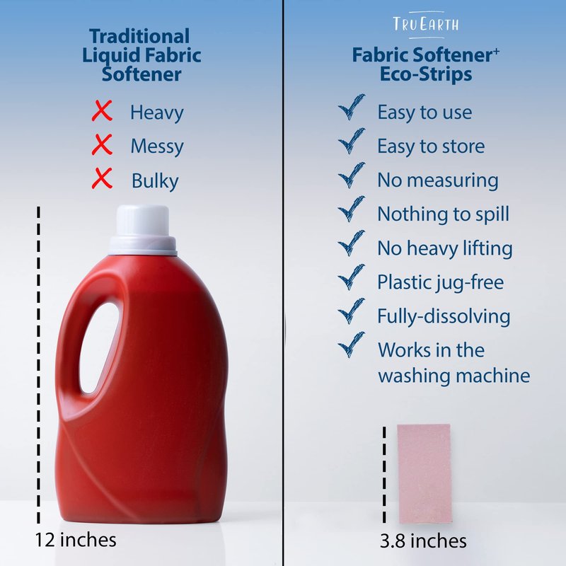 - THE MOST CONVENIENT METHOD: Tru Earth Fabric Softener Eco-Strips end the need for heavy plastic jugs and messy liquid fabric softener. No measuring, no spills or splashes, these life hacks save space and eliminate hassle; great dorm room gift idea.