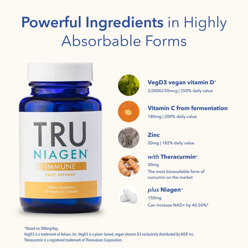 TRU NIAGEN Immune Support Supplement - Daily Defense - Vitamin C from Fermentation, Vegan Vitamin D3 2000 IU, Zinc, Plus Theracurmin (Curcumin) + Multi Award-Winning NAD Boosting Niagen 150mg 30ct