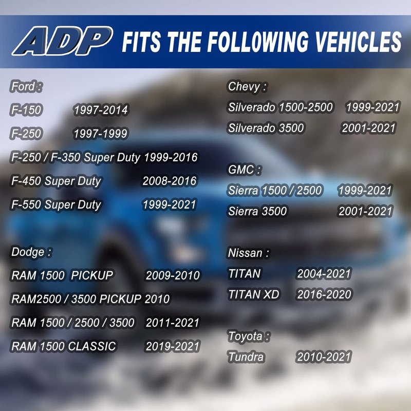 - 【Fit】1997-2014 Ford F-150, 1997-1999 Ford F-250, 1999-2016 Ford F-250/F-350 Super Duty, 2008-2016 Ford F-450 Super Duty, 1999-2021 Ford F-550 Super Duty, 1999-2021 GMC Sierra 1500/2500, 2001-2021 GMC Sierra 3500, 1999-2021 Chevy Silverado 1500/2500, 2001-2021 Chevy Silverado 3500, 2009-2010 Dodge RAM 1500 PICKUP, 2009-2011 Dodge RAM 2500/3500 PICKUP, 2011-2021 Dodge RAM 1500 2500 3500, 2019-2021 Dodge RAM 1500 Classic, 2004-2021 Nissan Titan, 2016-2020 Nissan Titan XD, 2010-2021 Toyota Tundra