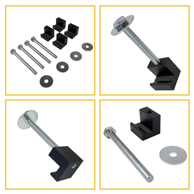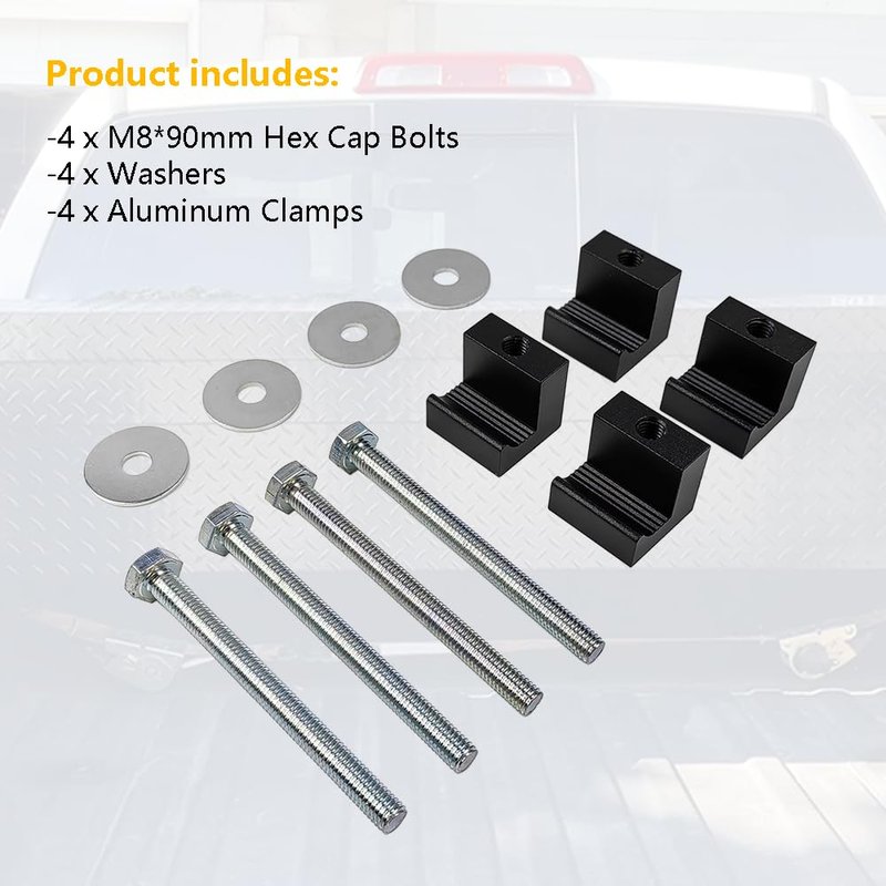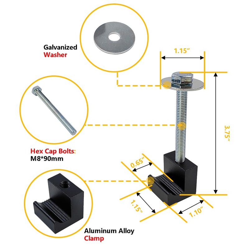 - Product includes: | 4 x M8*90mm Hex Cap Bolts | 4 x Washers | 4 x Aluminum Clamps |