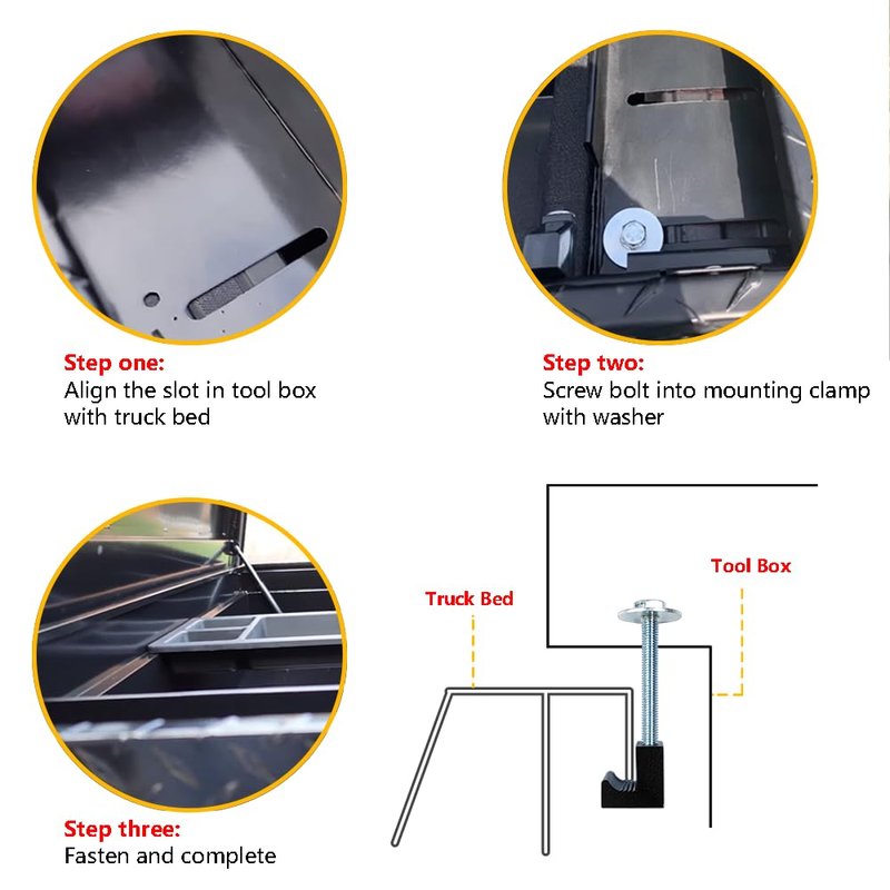 This product is used to mount the truck tool box on the truck bed. No drilling is needed by using this kit.