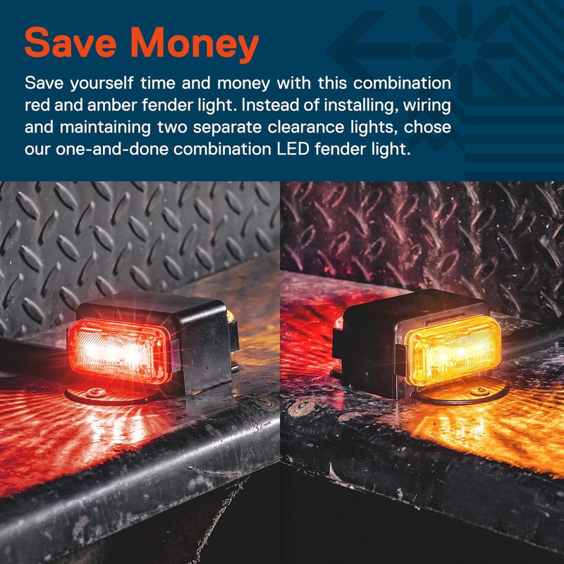 - SAVE MONEY - Save yourself time and money with this combination red and amber fender light. Instead of installing, wiring and maintaining two separate clearance lights, chose our one-and-done combination LED fender light.
