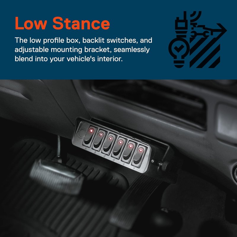 - WORKS WITH YOU - Mounting this switch box in, on, or under your dash? No problem. The slim design keeps it out of your way and out of your vision. Need momentary switches for your equipment? Easy. Momentary switch part# SWH0081A4 is a direct fit.