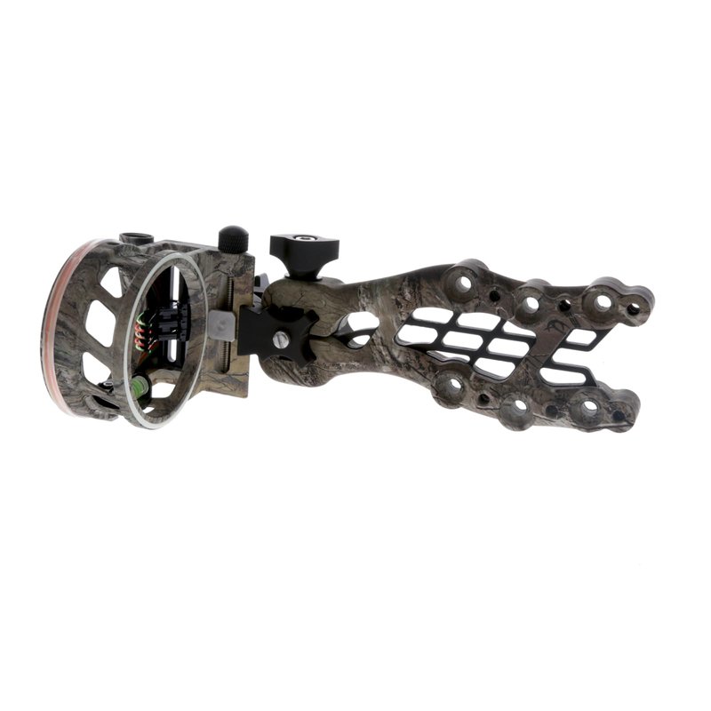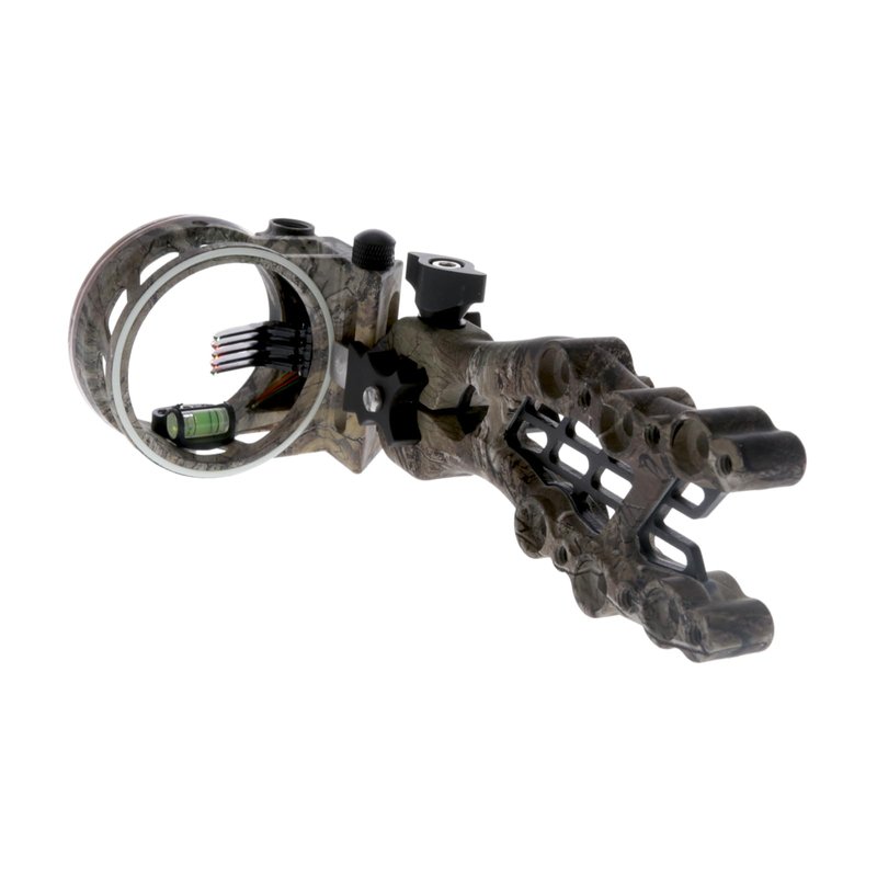 - SPECIFICATIONS - Aperture diameter: 1.9 in; Level: Adjustable 2nd and 3rd axis; Pins: 5 (5x.019 in. dia.); Windage Elevation: Tooless Micro-adjustable; Finish: Real-Tree Xtra Camo; LED light included.
