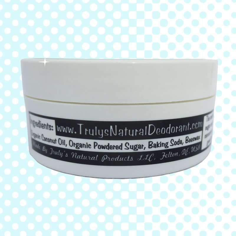 Truly's will keep you smelling fresh even if you sweat a great deal over the course of a day without having to reapply. How does it work? The sugar in our deodorant combines with your own perspiration to create a hyper osmotic solution that prevents odor. Our finely milled baking soda works as another natural, powerful odor fighter. In addition, coconut oil is skin soothing and moisturizing. We use only the best organic coconut oil which has a wonderful light coconut smell. Truly's comes in BPA and PVC free food safe plastic containers. Because Truly's Natural Deodorant is coconut oil based and does not contain any chemical binders, stabilizers, emulsifiers, preservatives, or thickeners, it will change consistency at different temperatures. Truly's may melt while shipping during hot weather, so use caution when opening to avoid spilling. Melting does not harm the product and it will re-solidify. The Truly's Natural Deodorant container comes with a pressure seal which if peeled off carefully and reinserted into the base of the lid, will keep your container of deodorant from leaking even if it is in a liquid state. Just be sure to mindfully close the lid tightly before packing for travel, and it is not a bad idea to slip it in a baggie to be on the safe side. With Truly's Natural Deodorant, you don't have to compromise effectiveness to stay true to your health. Finally, a natural deodorant that lasts all day! Try it and see for yourself!