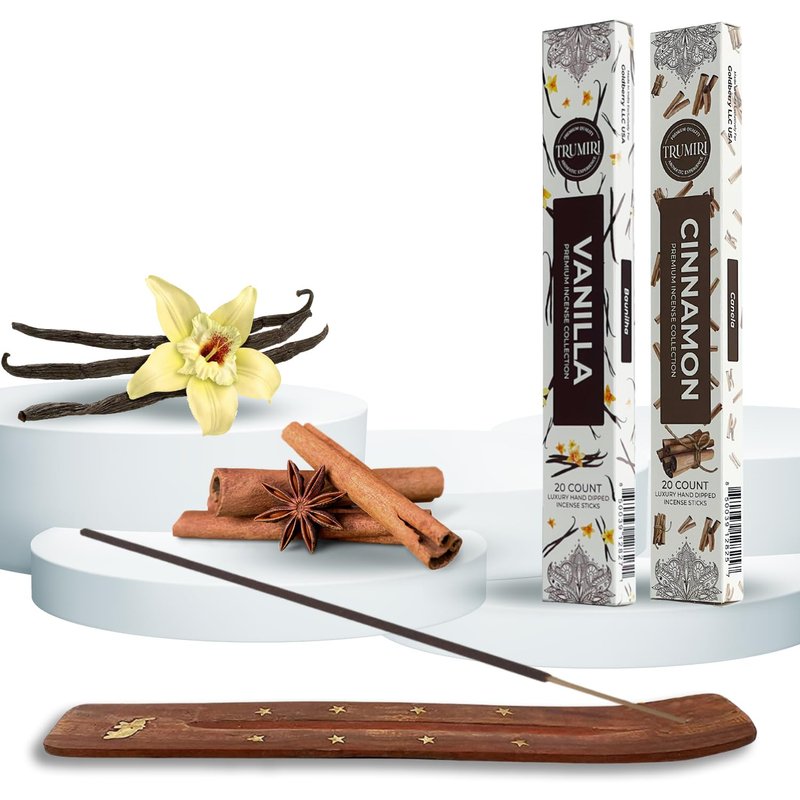 Step into a world of captivating scents and serene ambiance with Cinnamon and Vanilla Incense Sticks. Our collection of all-natural incense sticks offers an exquisite blend of fragrances, designed to elevate your senses and create a harmonious atmosphere in any space. Crafted with care, our incent sticks are made from the finest ingredients, ensuring a clean and non-toxic burning experience that promotes a sense of well-being. Experience the power of aromatherapy with our spiritual incense sticks. Infused with essences that evoke tranquility and serenity, these inciensos aromaticos are perfect for enhancing meditation, yoga, or any spiritual practice. Immerse yourself in the calming aroma and let the soothing properties of our incense cleansing create a sanctuary of peace and balance. Indulge in the long-lasting and invigorating fragrances of our long burning incense sticks. With their slow and steady burn, these incessant sticks offer an enduring aromatic experience, enveloping your surroundings with their essence. Feel the essence of agarbati sticks as they fill the air, creating a captivating and uplifting atmosphere that soothes the soul. Our incencens are carefully selected to deliver a strong and delightful scent that lingers in the air. Whether you're seeking a moment of relaxation, concentration, or simply a fragrant escape, our inciense sticks are designed to provide you with the perfect olfactory experience. Discover the long-lasting and enchanting aroma of our insentse, allowing you to unwind and find inner peace. With Trumiri Incense Sticks, you can transform any space into a haven of tranquility and sensory delight. Embrace the captivating aromas and let the incencio transport you to a world of serenity. Experience the essence of spiritual connection with our spiritual incense sticks, meticulously crafted to elevate your mind, body, and soul.