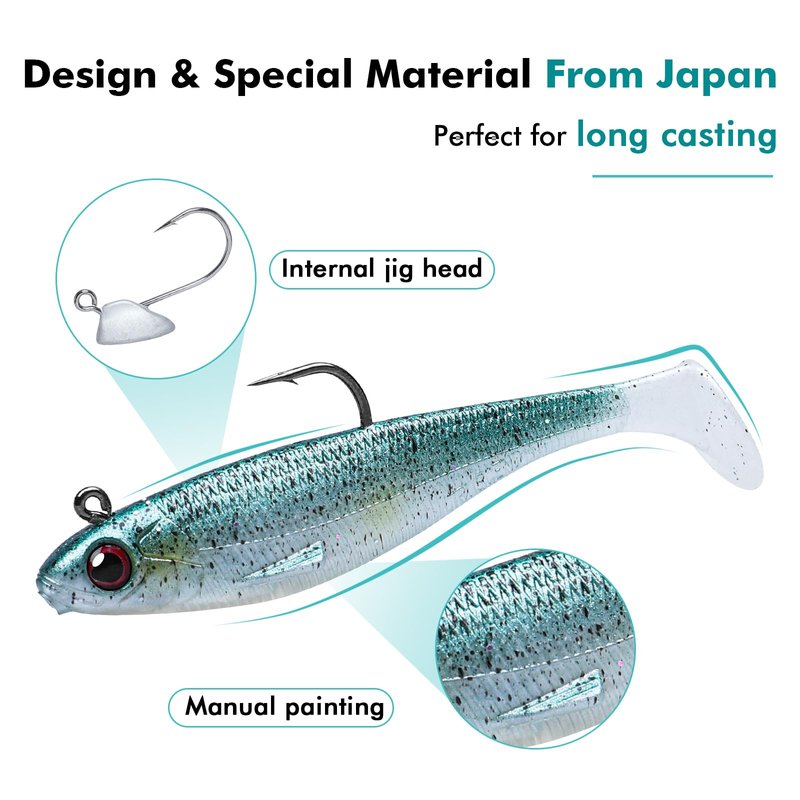 - LONG CASTING JIG HEAD - Having an ideal weight for long casting and slow sinking, Truscend fishing bait can achieve a slow, flutter presentation. Featuring a precisely engineered shape, the soft body swimbaits generate the perfect kicking action. You can easily cast the fishing jigs bait into your ideal fish area.