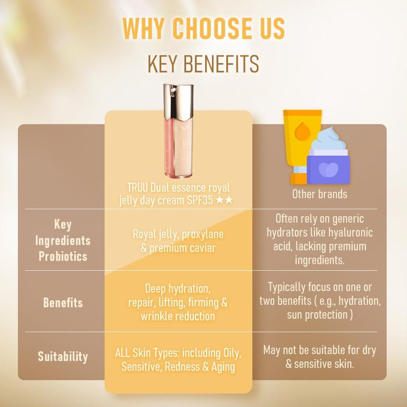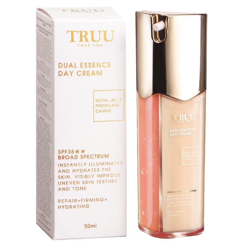 Experience the ultimate in anti-aging skincare with the TRUU Dual Essence Royal Jelly Day Cream SPF35. This luxurious formula combines royal jelly, proxylane, and caviar essence to provide deep hydration, firming, and UV protection, ensuring your skin looks and feels its best.