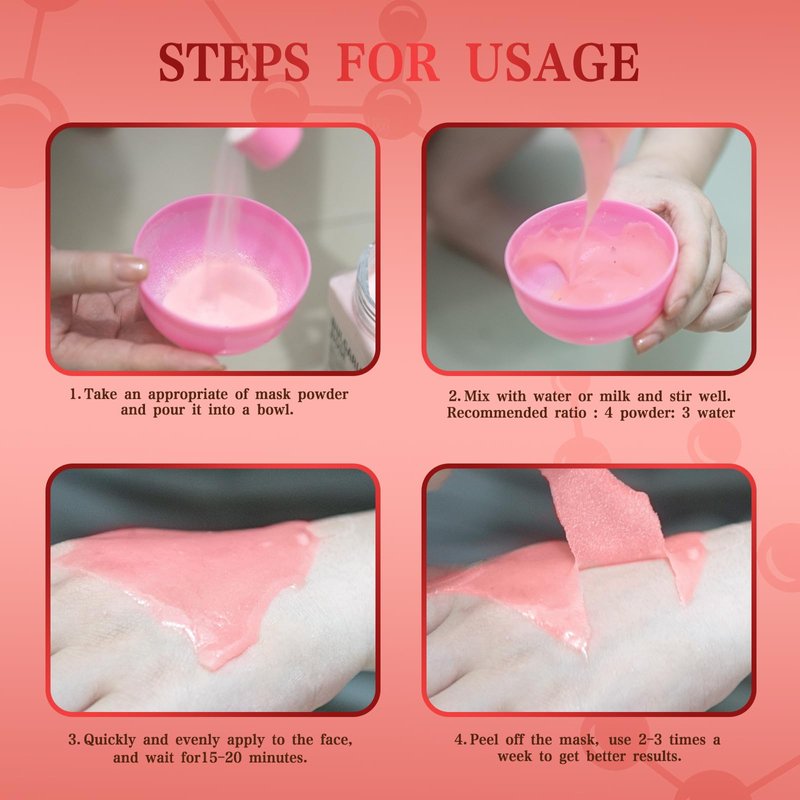 - 【HOW TO USE JELLY MASK POWDER】- Recommended 4 spoons of powder with 3 spoons of water / 4:3 ; 3 spoons of powder with 3 spoons of water ,you just apply the mask to your face, wait for 15~20 minutes, paste to form the overall elastic soft film, and after that gently take it off and rinse the face. It's that easy