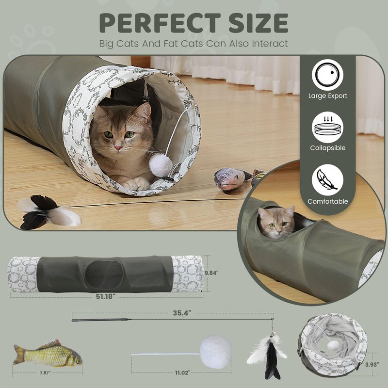 - DIFFERENT WAYS TO PLAY FOR CAT: Our cat tunnel is suitable for indoor cats, with two-way passage, peephole and hanging ball toys. The cat tunnel combination also includes a cat teaser and two small fish. This popular cat toy provides more entertainment for your kitten. Provide hours of exercise and self-entertainment, so that your fur child will not feel lonely. Remember, cat teasers are toys that are easy to wear out, but they can make your cat master have fun