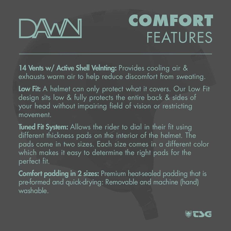 Get on with conquering those trails, rails, and parks, with reliable, impact protection from TSG Dawn Helmet. Retro-styled helmet with durable full-cut construction low cut earflaps, and extended lower back coverage, is the helmet of choice for BMX, snowsports, or skating.TSG Dawn uses special hardshell construction to connect shock-absorbing EPS liners to PP hard shells, creating super-strong helmets with extreme stability. TSG uses a less intrusive, full-cut design using extremely rugged single-mold construction. The hardshell coverage extends down to cover the ears as well.The low-fit profile covers the complete side and back of the head without limiting visibility or mobility. TSG helmets have ample airflow channels to prevent heat build-up by circulating fresh air for riding comfort.A good fit is extremely important for comfortable biking or skateboarding. Riders can easily adjust the fit using pads of different thicknesses inside the helmet. It is particularly important that riders try out and optimize the fit using these pads so that they can ride in comfort with better riding focus. These removable pads dry quickly after cleaning by hand or machine wash.Worry stops with Dawn helmets, with the guaranteed quality that is regulated by international safety standards such as the European standard for skateboarding helmets Designed in Switzerland, all TSG products are tested by an internal team of passionate riders.TSG Dawn helmet comes in two sizes: S/M and L/XL, or head circumference of 54-56 cm or 57-59 cm respectively.Specs:Uses: Dirt/Park, Vert/ParkWeight: 460 gmMaterial: PP (PROPENE POLYMER), EPS, POLYESTER, NYLONHead circumference: S/M: 54-56 cm, L/XL: 57-59 cm. Recommended age: 18 and above