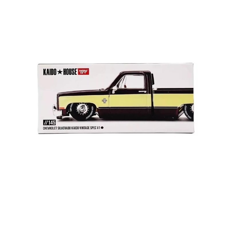 Immerse yourself in the nostalgic charm of this 1/64 (3 inches) scale Chevrolet Silverado Kaido Vintage Spec V1 diecast model from Kaido House. This meticulously detailed replica captures the iconic style of the classic Silverado pickup truck, featuring a sleek black and yellow two-tone paint job. Crafted with precision, the model showcases intricate details like the chrome accents, whitewall tires, and the distinctive Kaido House branding. Whether you're a collector or simply appreciate automotive history, this diecast model is a must-have for your collection. Measuring approximately 5 inches long, it's a perfect size for display on your desk or shelf. Bring a touch of vintage Americana to your space with this stunning Chevrolet Silverado Kaido Vintage Spec V1 diecast model.