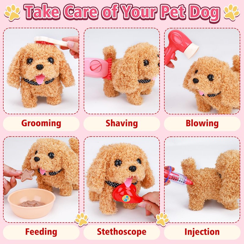 - 【Puppy Toys for Kids】Open the switch and the cute stuffed dog will walk, bark, wag its tail and nod its head just like a real dog. When you pat the dog’s head, it will also make sound, very cute and funny. Kids can learn to take care of their dogs, pretend to check and treat the toy puppy, experience a variety of pet activities such as feeding, washing, grooming and clipping. Great interactive toys for 2 3 4 5 6 year old girl birthday gifts.