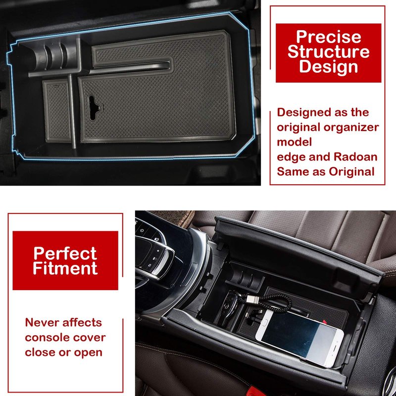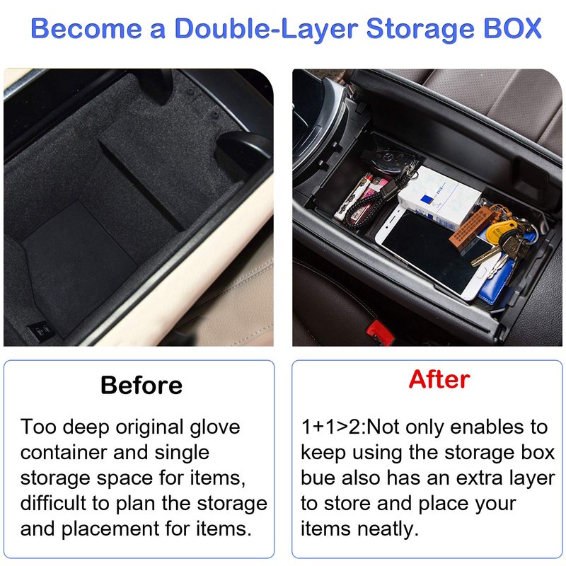 - Useful Car Tray Organizer: This organizer leads to an extra space for the center glove box, so that we could neatly store and place more items, like phones, wallet, sunglasses, change, business cars, and so on.