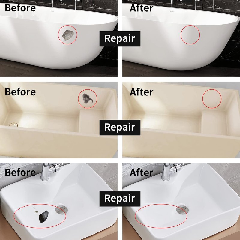 We can help you below!Cracked tub and sinks missing chunk of porcelain or chips on your bathtub and sink cracks on shower stall tiles worn and holes on toilets Brought to You By Globalcom Save tons of money instead expensive professional repairs The color of the product exactly the same as the bathtub you are going to repair. Strong repair, up to 5years Can be repaired in 10minutes Safe for children and pets Questions you may care about Q: can this product matches for my bathtub? A: Our products can fit most of the toilets, bathtubs, tiles on the market,its really colors match . Q: How large of a crack can this repair? A: Product parameters (diameter=2inch, height=0.4inch), and we have 2 bottles (Part A and Part B) Tips for avoiding sandpaper and keeping it clean After using the mixture to patch the surface, You can use clear tape to cover the surface, then make sure the surface is smooth. When the mixture is dry, remove the clear tape.