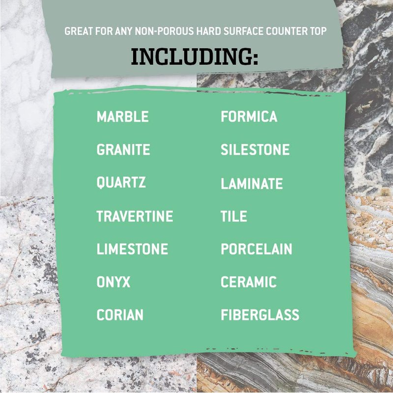 - Safe for stone surfaces, marble, granite, quartz, travertine, limestone, onyx, Corian, Formica, Silestone, laminate, porcelain, tile, ceramic, fiberglass and any non-porous hard surface countertop