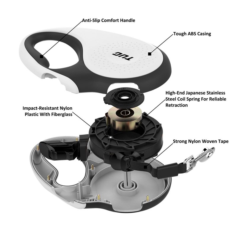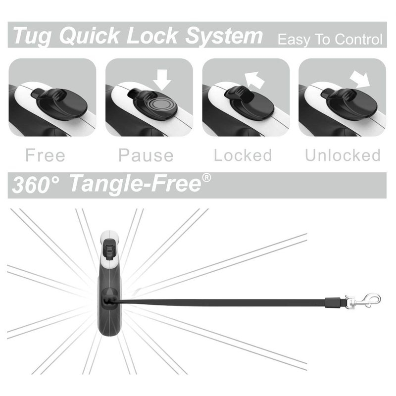 TUG 360° Tangle-Free Retractable Dog Leash with Anti-Slip Handle | 16 ft Strong Nylon Tape | One-Handed Brake, Pause, Lock (Small, White)