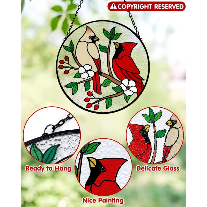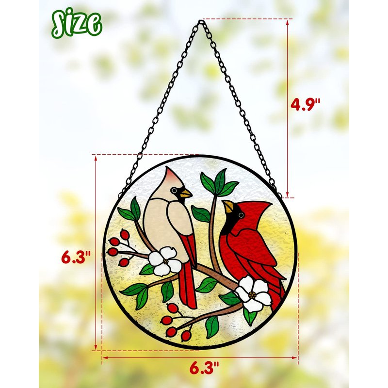 - MULTIPLE APPLICATIONS - Cardinals on a branch stained glass suncatcher will show different colors in different lighting conditions. When the sunlight comes through, it will become more gorgeous and looks colorful. This suncatcher is helpful for your home decoration. Meanwhile, it is also a creative gift for mom, grandma, friends, teachers, classmates, colleagues, bird lovers, etc.