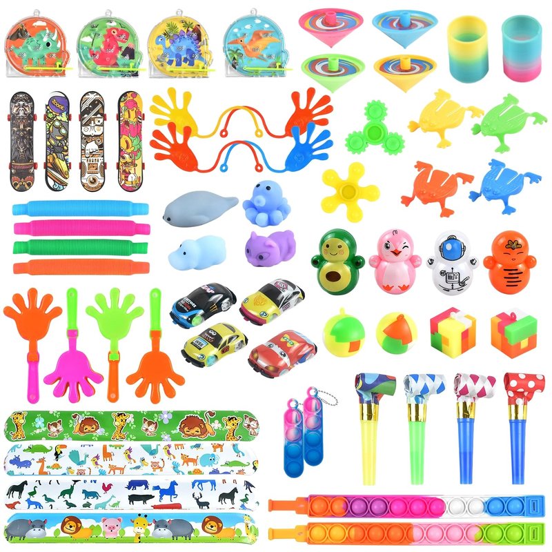 - Multiple Variety Party Favor Pack: High quality collection of 60Pcs prizes toys bundle treasure box toys assortment for Kids. 4 Mini Pop Keychain It Fidget Toys, 6 Colored clay,4 Snap Bracelet,6 Marble disk,4 Finger skateboard,4 Building block,4 Sticky Hands,8 Geostrophic, 4 Tumbler toy, 4 Shoting machine, 4 Versatile pipe toy, 4 Pull back Car, 2 Speed cube, 5 Engineering vehicle