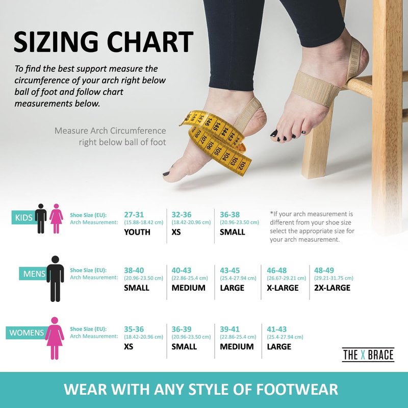 USE SIZE CHART TO DETERMINE YOUR CORRECT SIZE. The beauty and effectiveness of the Tuli's X Brace lies in its ease of use and simplistic design while providing the ability to address a very complex issue with incredible success. This unique elastic foot arch support is commonly used by people suffering from foot pain due to Plantar Fasciitis, Sever’s Disease, flat feet, fallen arches, and over-pronation. The unique “X” design found on the X Brace reduces the tension and stress placed on the plantar fascia ligament by limiting the amount of stretching it can do. It is a reusable elastic brace that works very similar to how the Low-Dye taping technique works commonly used by physical therapists other medical professionals to treat their patients with plantar fasciitis and Sever’s Disease. No tape necessary. The X Brace is simple, effective and fits into any lifestyle effortlessly. Socks or shoes, no problem; wear the X Brace with anything including flipflops, sandals, high heels or any other shoe or no shoe at all. You choose your activity, footwear or lack thereof and the X Brace will support your arch and prevent the pain. We recommend wearing the X Brace initially for a few hours per day and gradually increasing up to 12 hours per day as needed. The X Brace has a low profile design and an integrated silicone strip on the heel strap for added comfort and grip, making it comfortable to wear with any style of footwear. It may be worn during or after activities and with or without shoes. DO NOT wear Tuli's X Brace while sleeping. Sold as a pair. The Tuli's X Brace is NOT to be used by individuals with diabetes, neuropathy, or vascular disease.