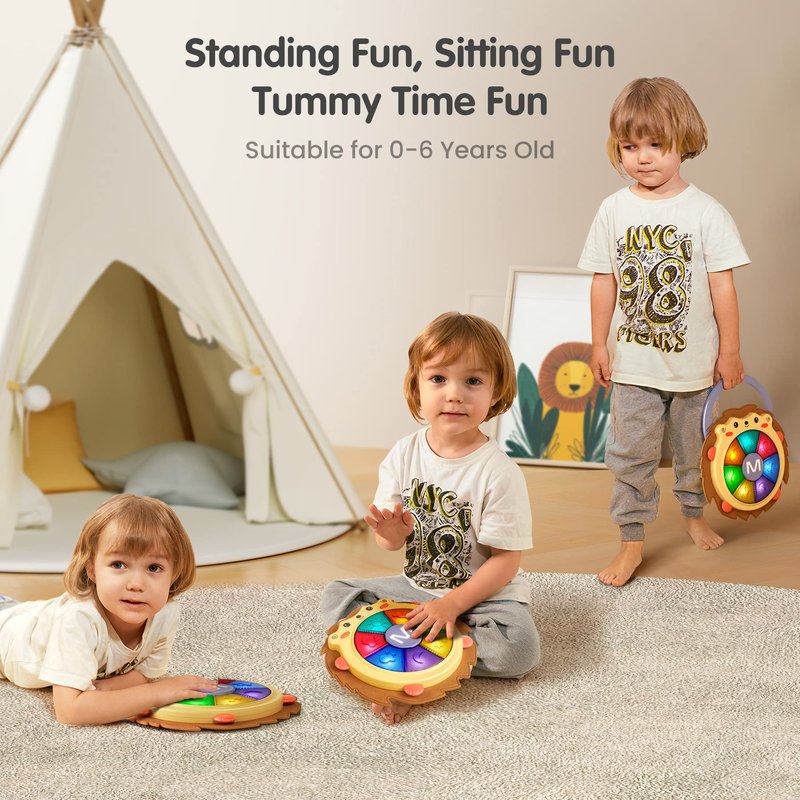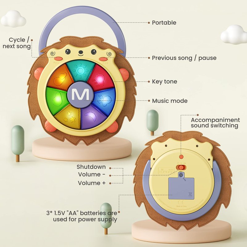 - Baby Music Sound & Light Toy: (powered by 3 x 1.5V AA batteries, not included in the package): There are 2 different modes in the toy for children to choose: 7 animal sounds and baby songs and 7 different drums. The colorful lights catch baby’s attention that they can make different sounds by playing drums with his hands.