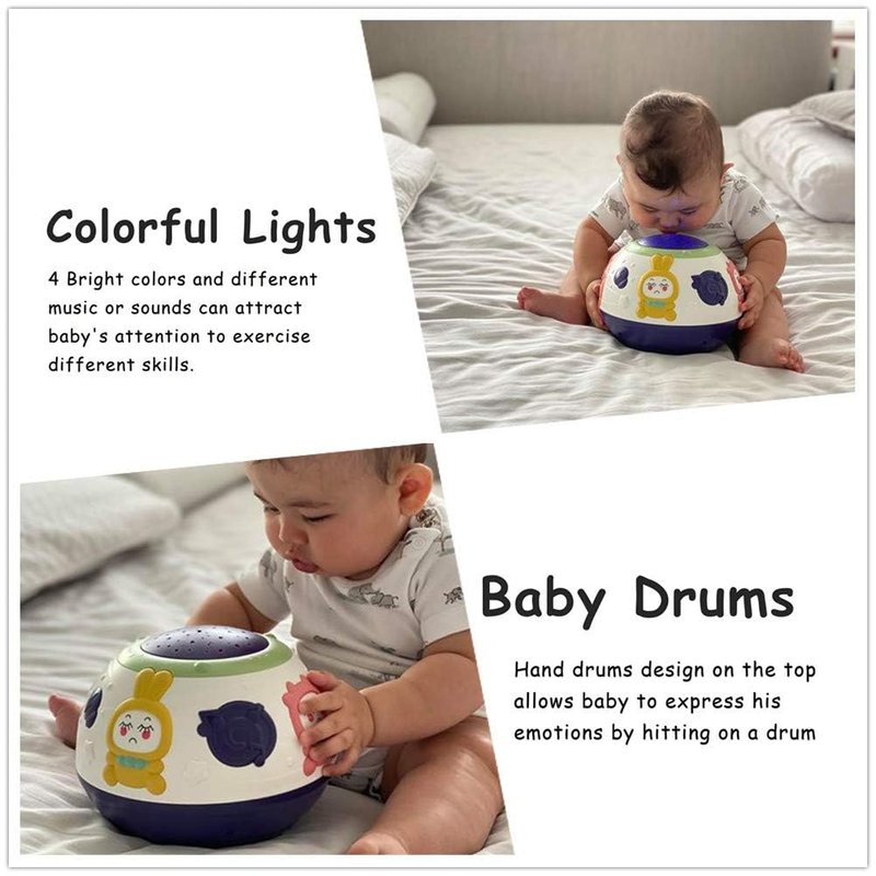 - Baby Drum Music Toy : Hand drum design on the top allows baby to express his emotions by hitting on the drum. 4 Bright colors and different music or sounds can attract baby's attention to exercise different skills.
