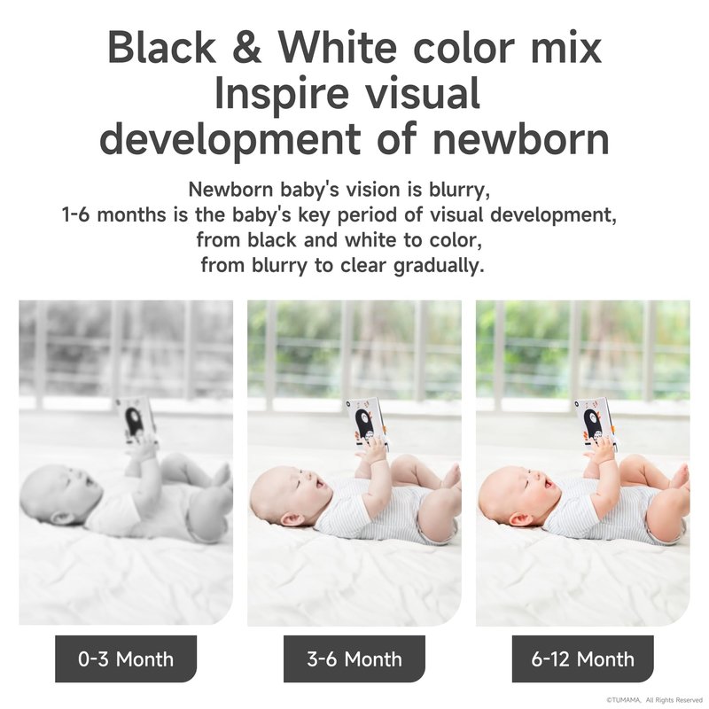 - Visual Stimulation for Newborn :The high contrast baby toys set features 0-12 months infants and to stimulate baby's vision and cognitive development,they are sensitive to black and white color. The mirror is made of acrylic, it is resistant and 180 degree bend without crease.