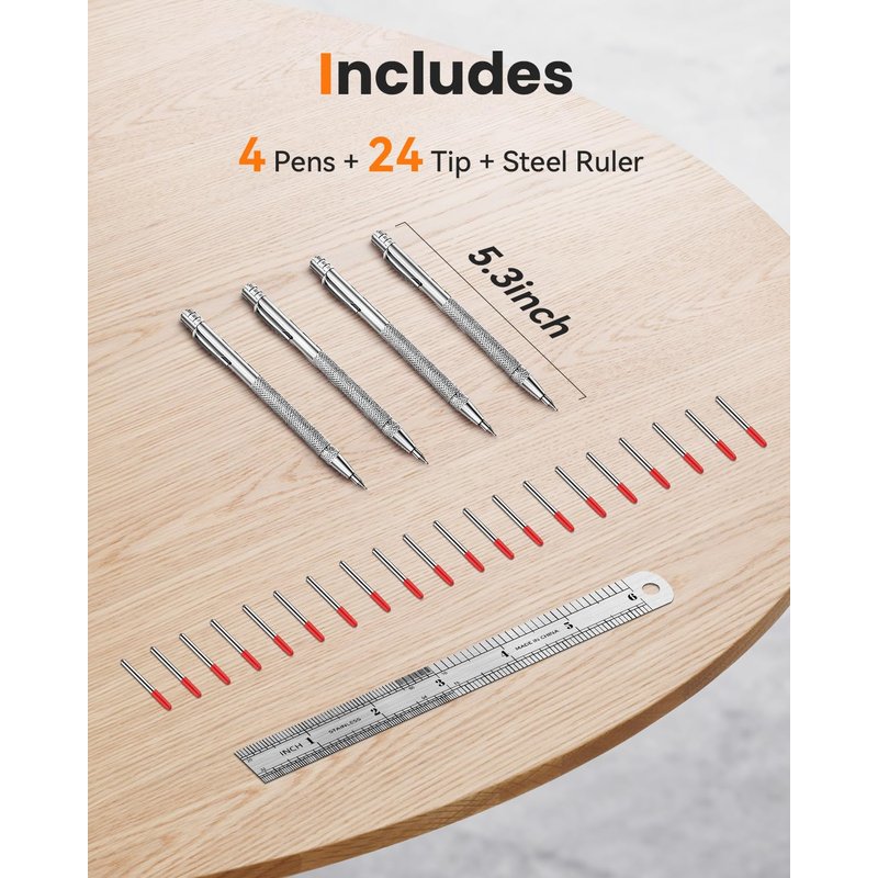 - Each pack of Tungsten Carbide Scriber comes equipped with 4 scribers and a free bonus of 24 replacement marking tips and a Steel Ruler, offering you ample durability and longevity for all your artistic projects. The knurled aluminum handle allows you to maintain maximum control while ensuring comfort during use.