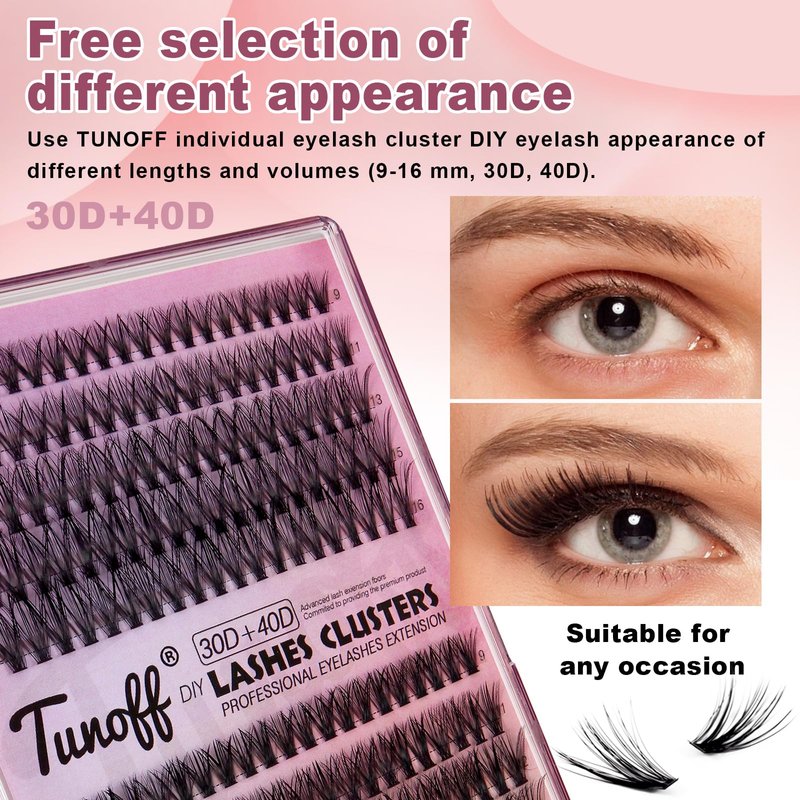 - [Free selection of different appearance]: Use TUNOFF individual eyelash cluster DIY eyelash appearance of different lengths and volumes (9-16 mm, 30D, 40D). cluster eyelash extensions for a variety of occasions, at home, at business, at shopping, at parties, whether it's a night out with friends, special occasions, or a day of work. You will achieve all of these looks very soon!