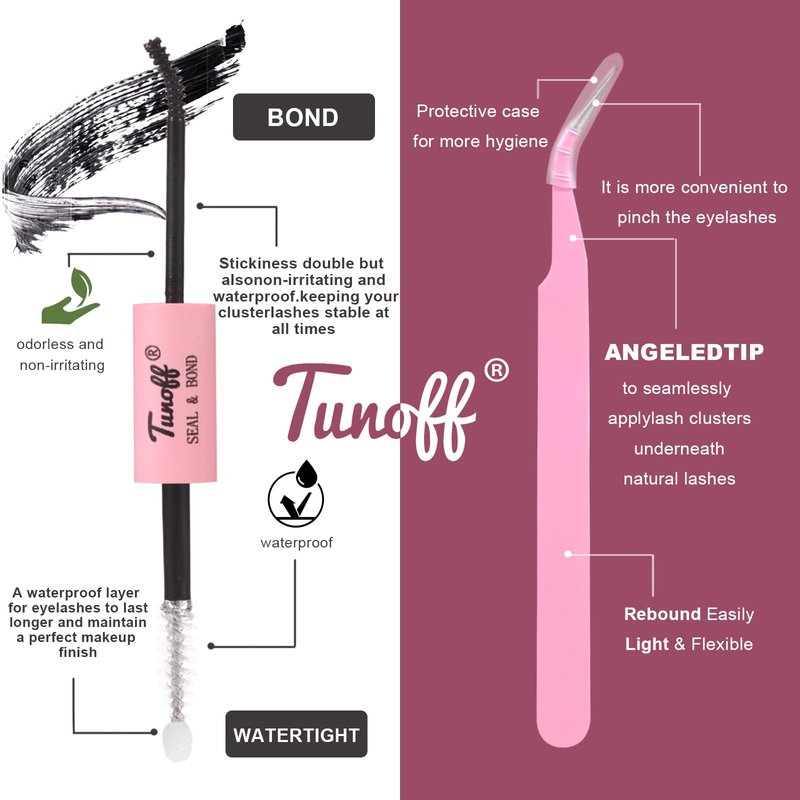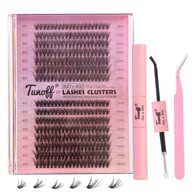 - [Kit contains]: TUNOFF Lash Extension kit per box provides 300 Lash Clusters (30D + 40D), eyelash adhesive and seal * 1, eyelash applicator * 1. Using our DIY Cluster Eyelash Extensions it perfect extended look has never been simpler and this kit gives you everything you need to use at home. Save time and budget to go to an eyelash salon.