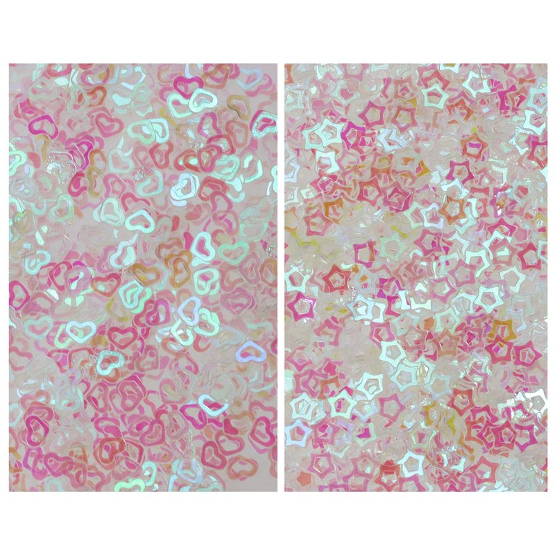 - These holographic glitter confetti are machine cut with standard heart shape and star shape. The shiny and sparkly surface will change its colors according to the change of angles. Each glitter flake has charming and bright colors that can retain its shiny appearance for a long time. Perfect for making lovely crafts and gifts.
