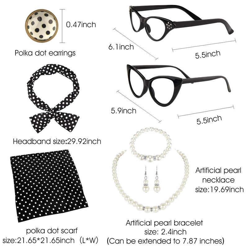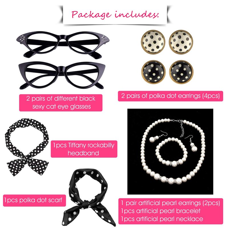 - Package includes: 2 pairs of different black sexy cat eye glasses(NO GLASSES), 2 pairs of polka dot earrings(4pcs), 1pcs Tiffany rockabilly headband , 1pcs polka dot scarf,1 pair artificial pearl earrings(2pcs), 1pcs artificial pearl bracelet, 1pcs artificial pearl necklace.