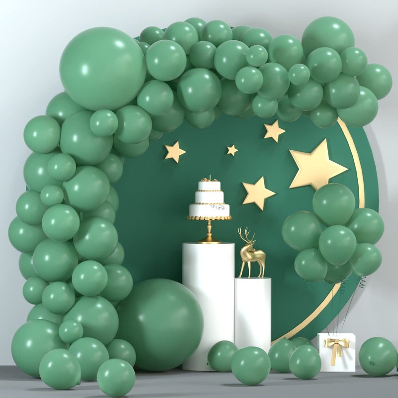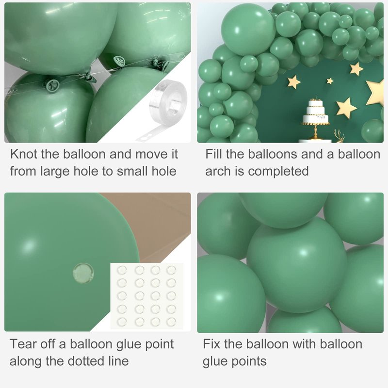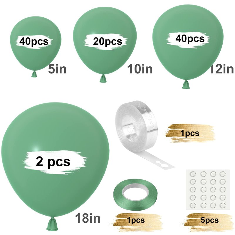 - Sage green balloon garland Kit: include 102 pack green balloons in 4 different sizes with ribbon, garland strip and glue point, suitable for different places decoration