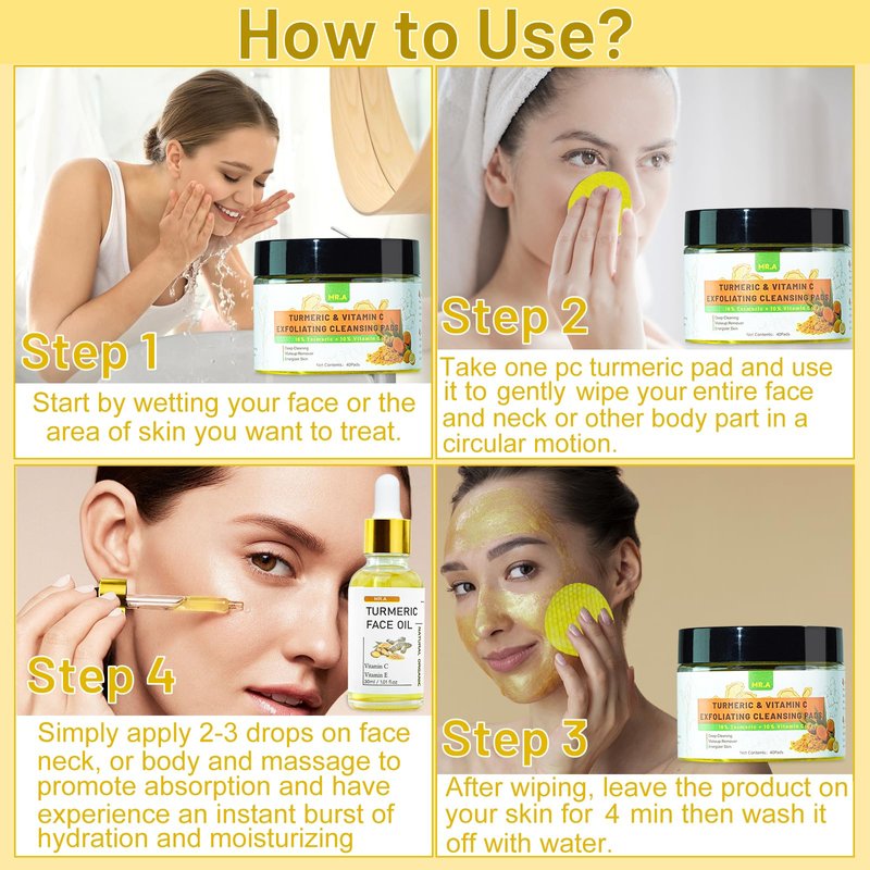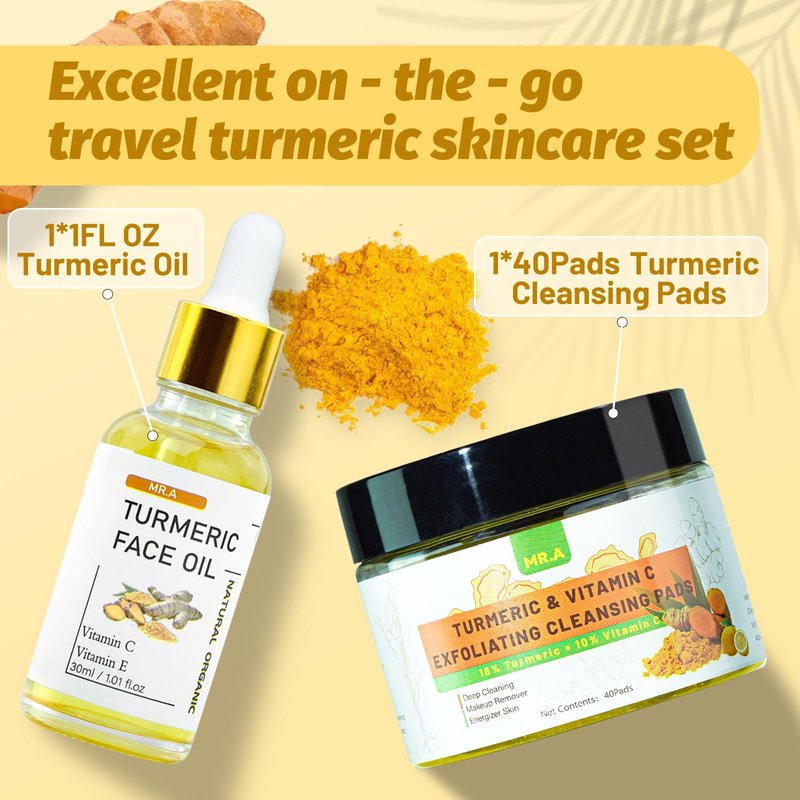 - 【Convenient On-the-Go Turmeric Cleansing Pads】Each Turmeric Cleansing Pads contains 40pcs turmeric face pads. These cleansing pads are perfect for travel, offering a hassle-free way to maintain a skincare routine. The perfect size of tumeric pads and tumeric oil to toss in your purse or gym bag.