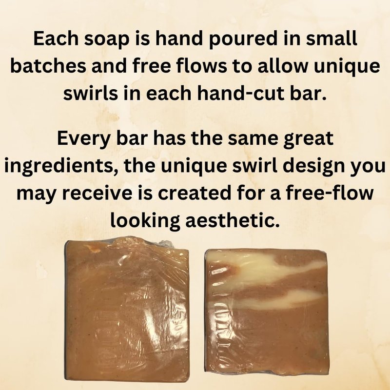- Weight: ~4 oz All soaps are handmade, hand-poured, and hand-cut. Each bar may vary uniquely in swirl design and color. The sizes may vary more or less by .3 ounces.