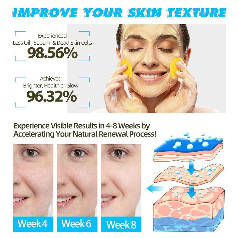 You may experience temporary purging as your skin eliminates excess oil, sebum, and dead skin cells. It takes 4-8 weeks to speed up the skin's natural shedding and renewal process. Contains turmeric which may cause skin staining. Do not use if allergic to turmeric or any listed ingredients. Discontinue use if irritation occurs. May contain small bits of lemon peel or other ingredients. Results may vary.