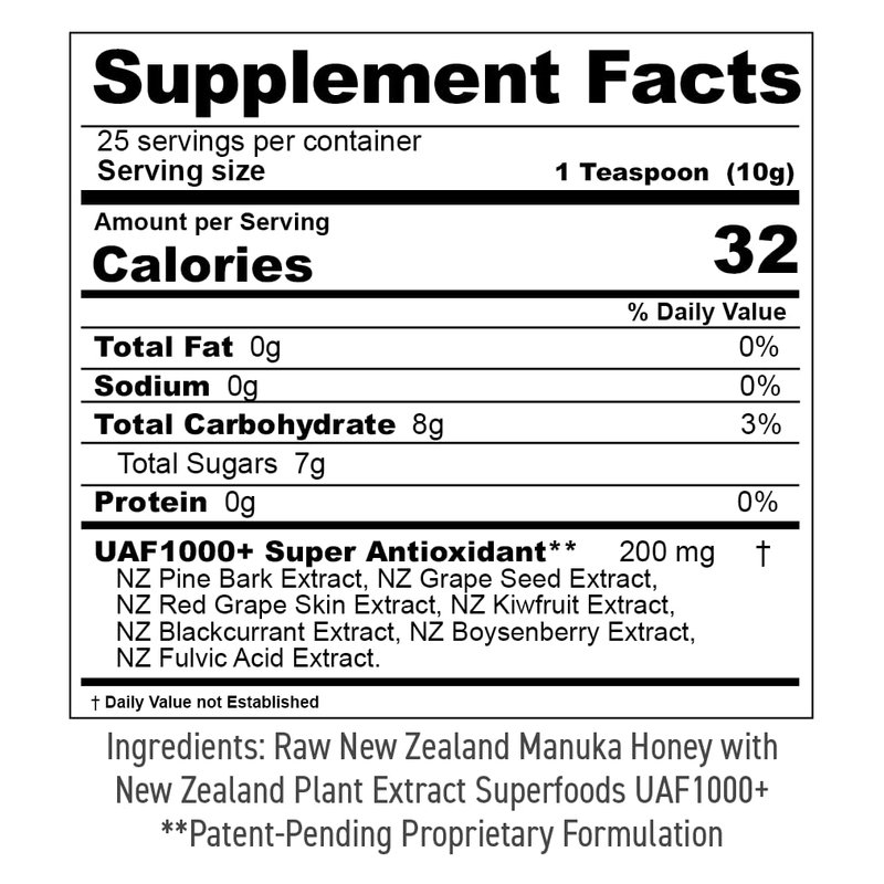 - UAF1000+ stands for Ultimate Antioxidant Factor 1000+. We blend these powerful antioxidant superfoods with certified manuka honey to create the strongest superfood. We serve the only Honey Manuka in the world utilizing New Zealand full-spectrum antioxidants.