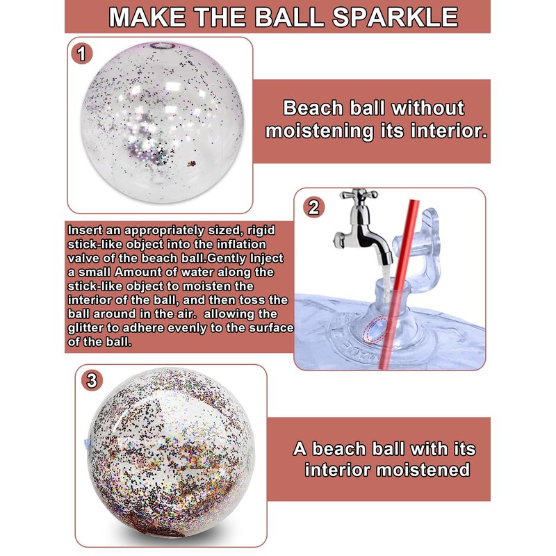 - Perfect Summer Gifts: The inflatable glitter beach ball are filled with pink sequin, and when you move the beach ball the glitter sequin creates changing different effects under the sunlight. It can exercise baby's hands, eyes, brain coordination and cognitive ability. The ball are very pretty and chic, add something different and new to your happy party time, it is a very interesting props.