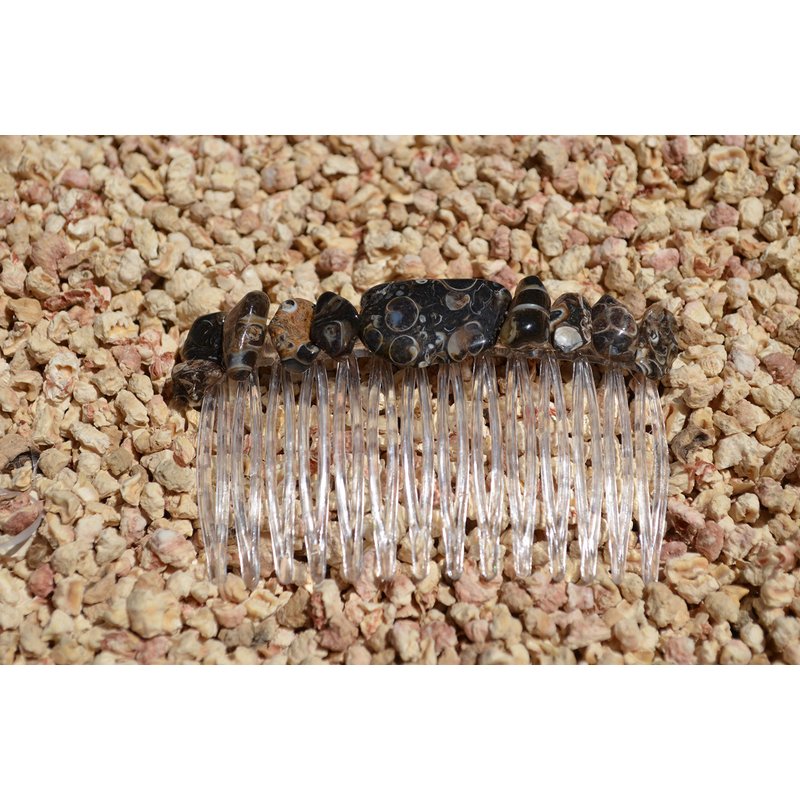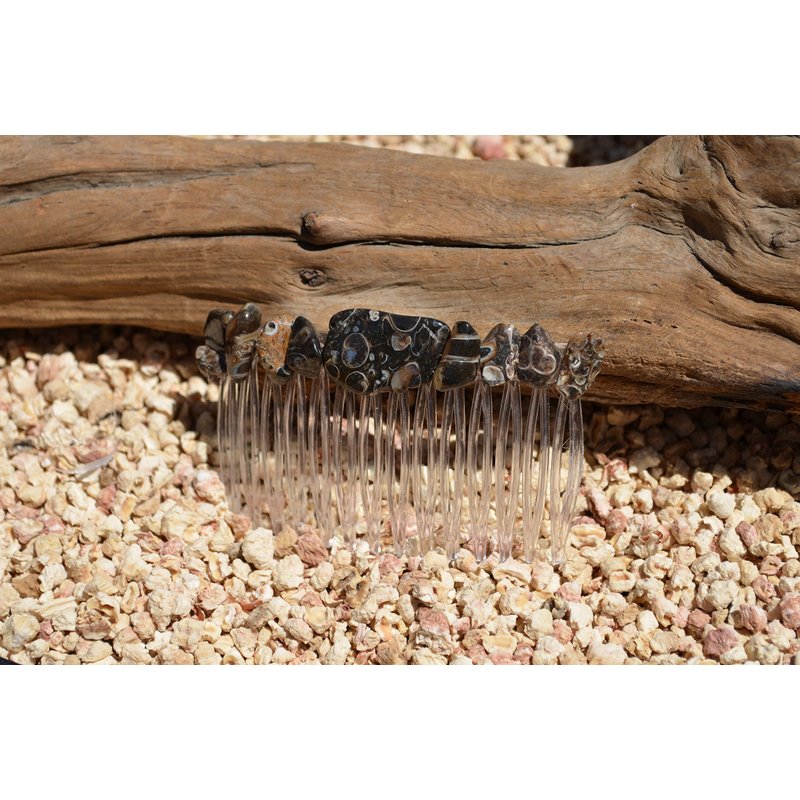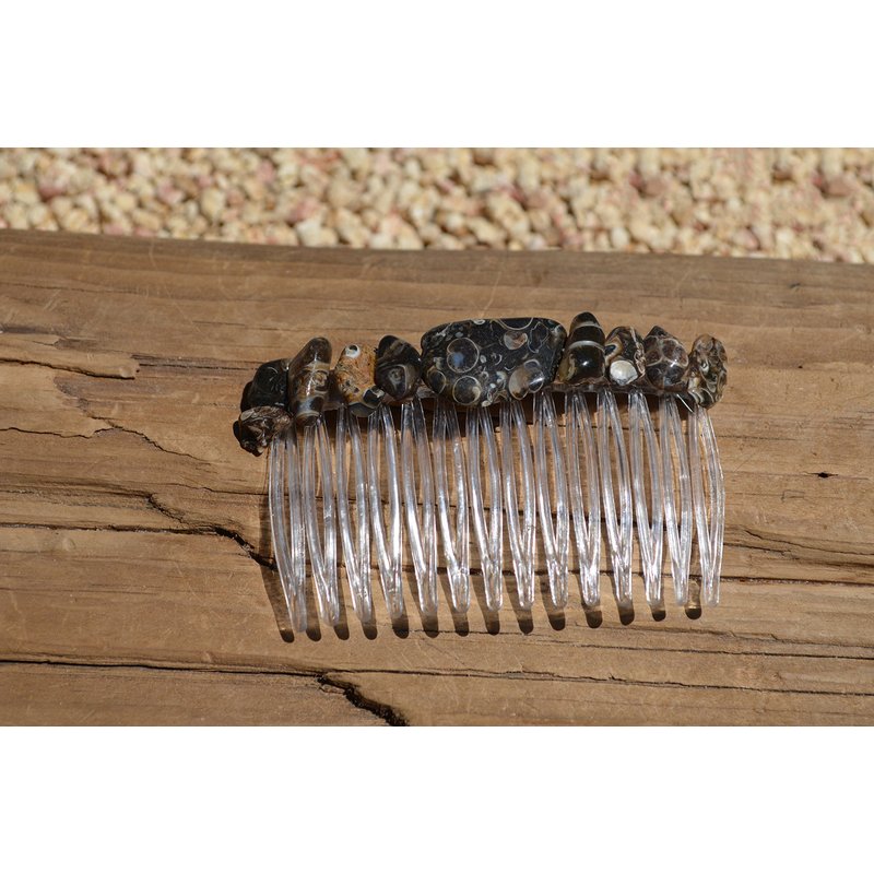 Pretty turritella stone hair comb. The turritella stone hair comb is adorned with small tumbled turritella stones. The turritella hair comb is the perfect accessory for a night out, and can dress up an outfit or be used for a special event, like a quinceanera, first communion, or even a wedding. The hair comb is hand made in the USA and come from a smoke free environment The turritella hair combs measure: 67 mm x 41 mm or 2.65 inches x 1.6 inches
