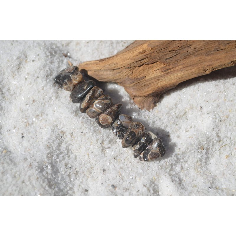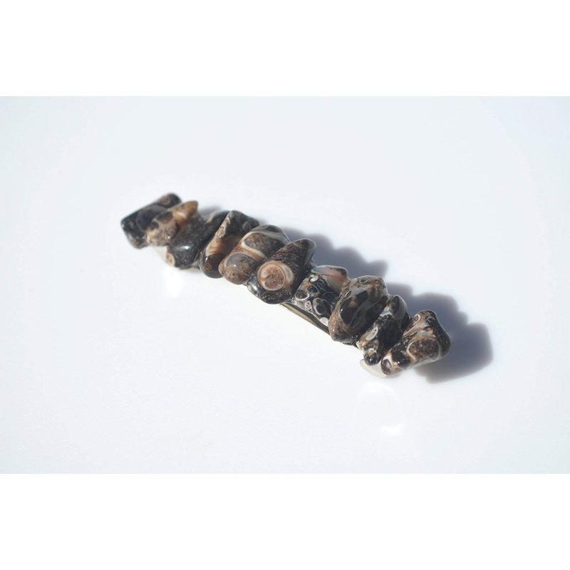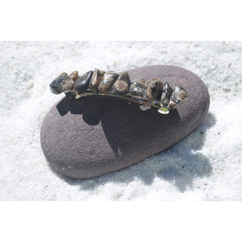 Pretty turritella stone french barrette, the stones have a gorgeous coloring. The stone french barrettes adorned with small turritella stones. The turritella stone hair clip is the perfect accessory for a night out, and can dress up an outfit or be used for a special event, like a quinceanera, first communion, or even a wedding. The hair clip is hand made in the USA and come from a smoke free environment The turritella stone hair clip measure: 61 mm x 16 mm x 15 mm or 2.4 inches x .6 inches x .57 inches.